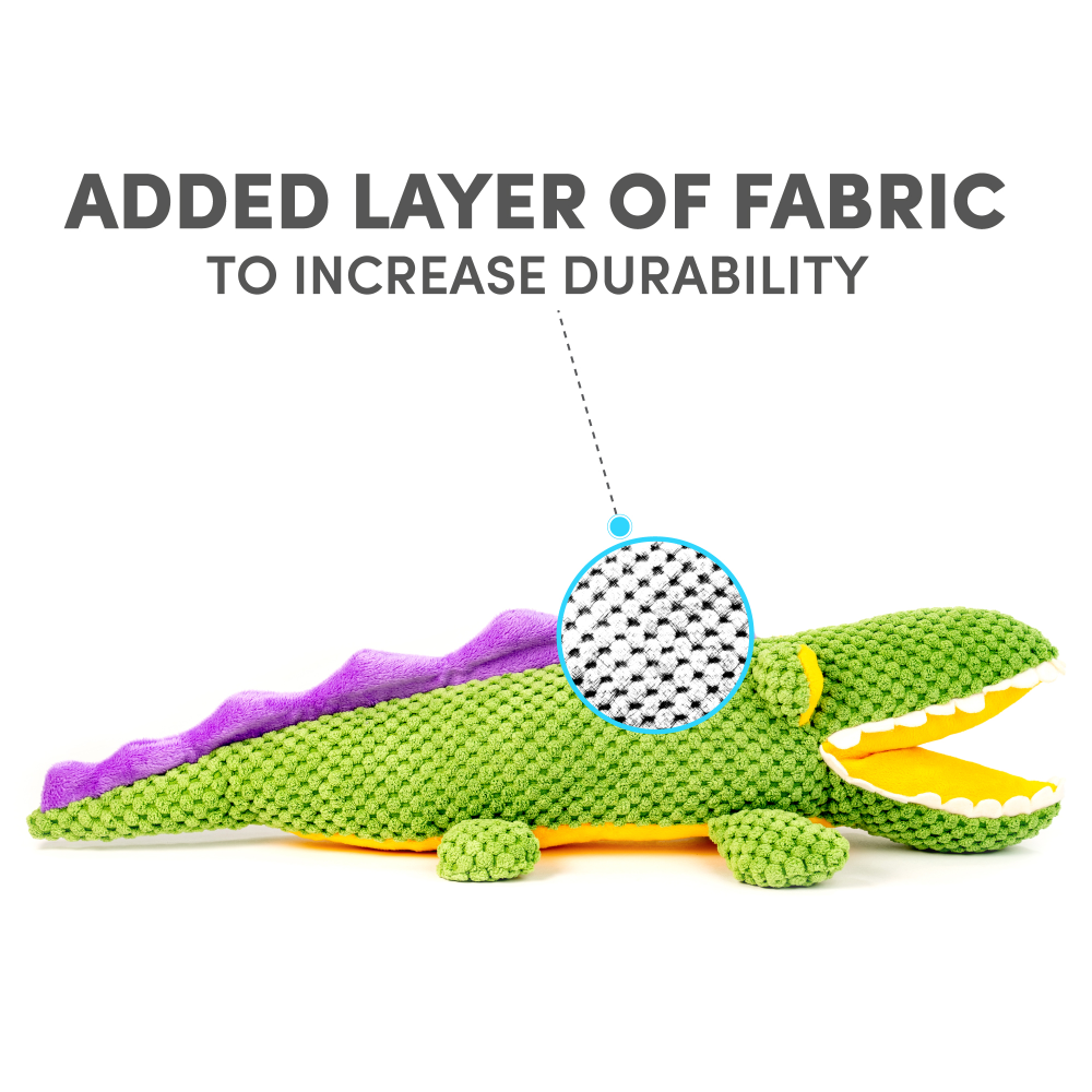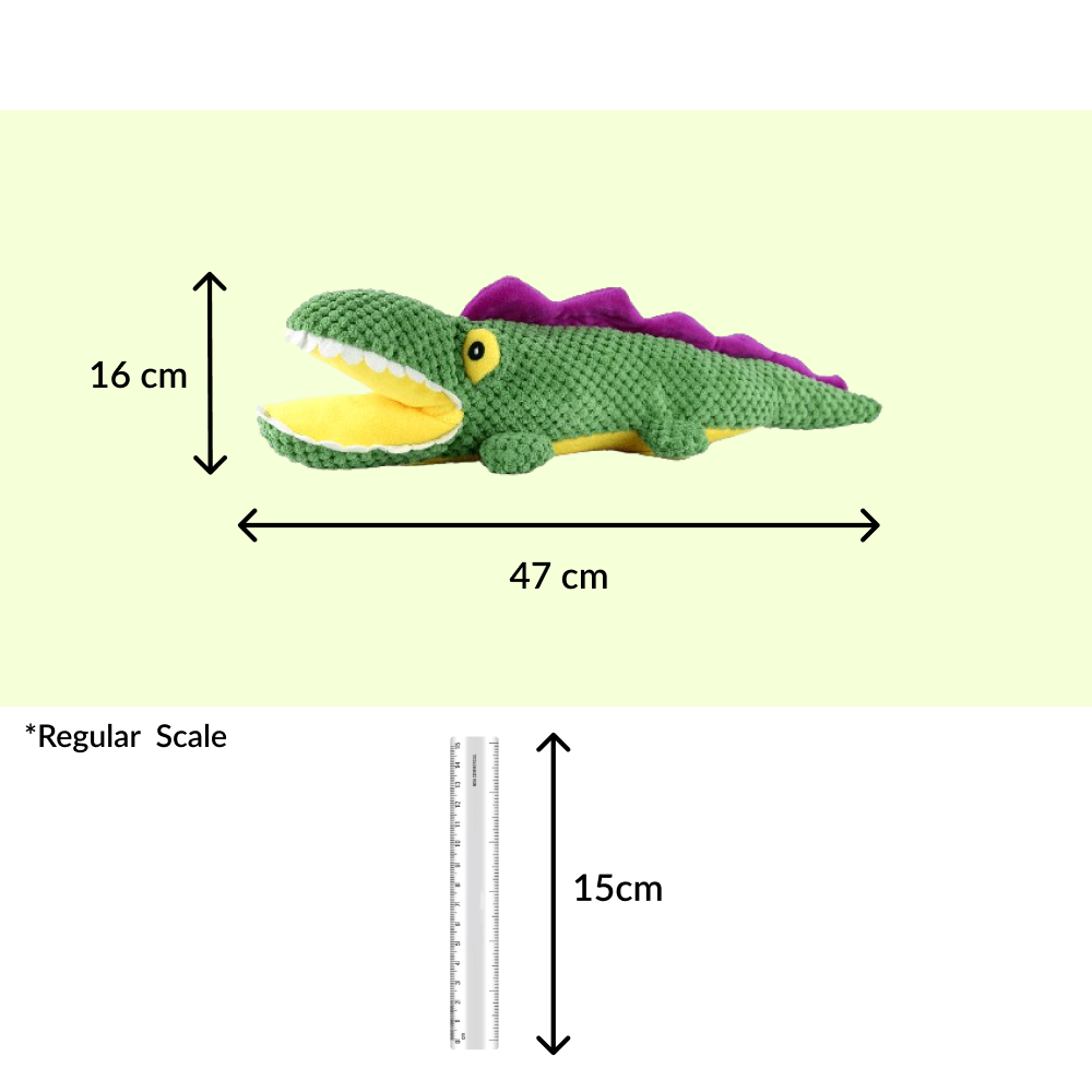 Meet Aly the Gator, a playful, soft, and squeaky plush toy designed to keep your dog engaged and entertained! Created by Barkbutler, Aly the Gator is crafted from durable, reinforced fabric that makes it perfect for medium chewers. This charming green gator is ideal for dogs of all breeds, weighing between 5-30 kgs, providing endless opportunities for cuddling, playing, tugging, and training.