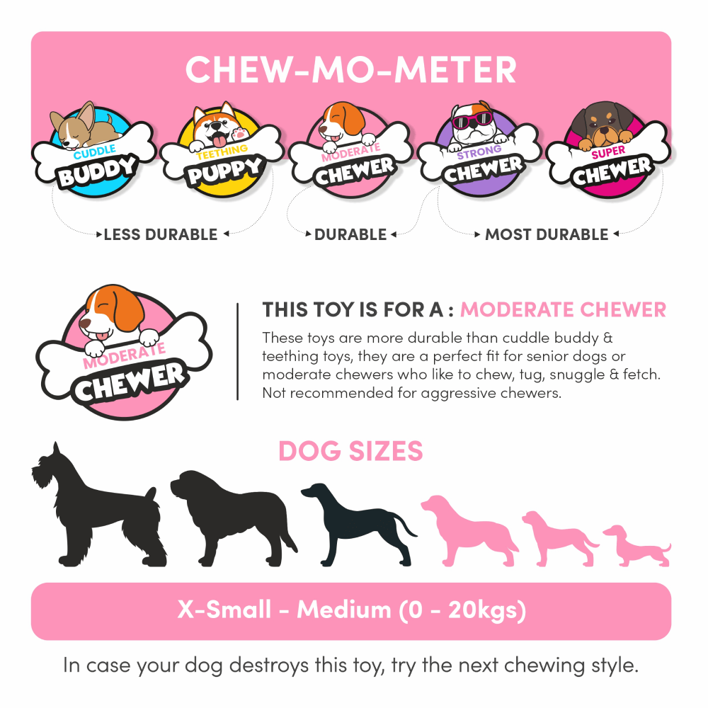 - Lasts Longer with Moderate Chewers – These toys are more durable than cuddle buddy and teething toys, making them a perfect fit for moderately agressive chewers between 0-20kgs, such as Shih Tzu, pugs, beagles, Indies, dachshunds, spitz, and shih tzus. Not recommended for aggressive chewers.