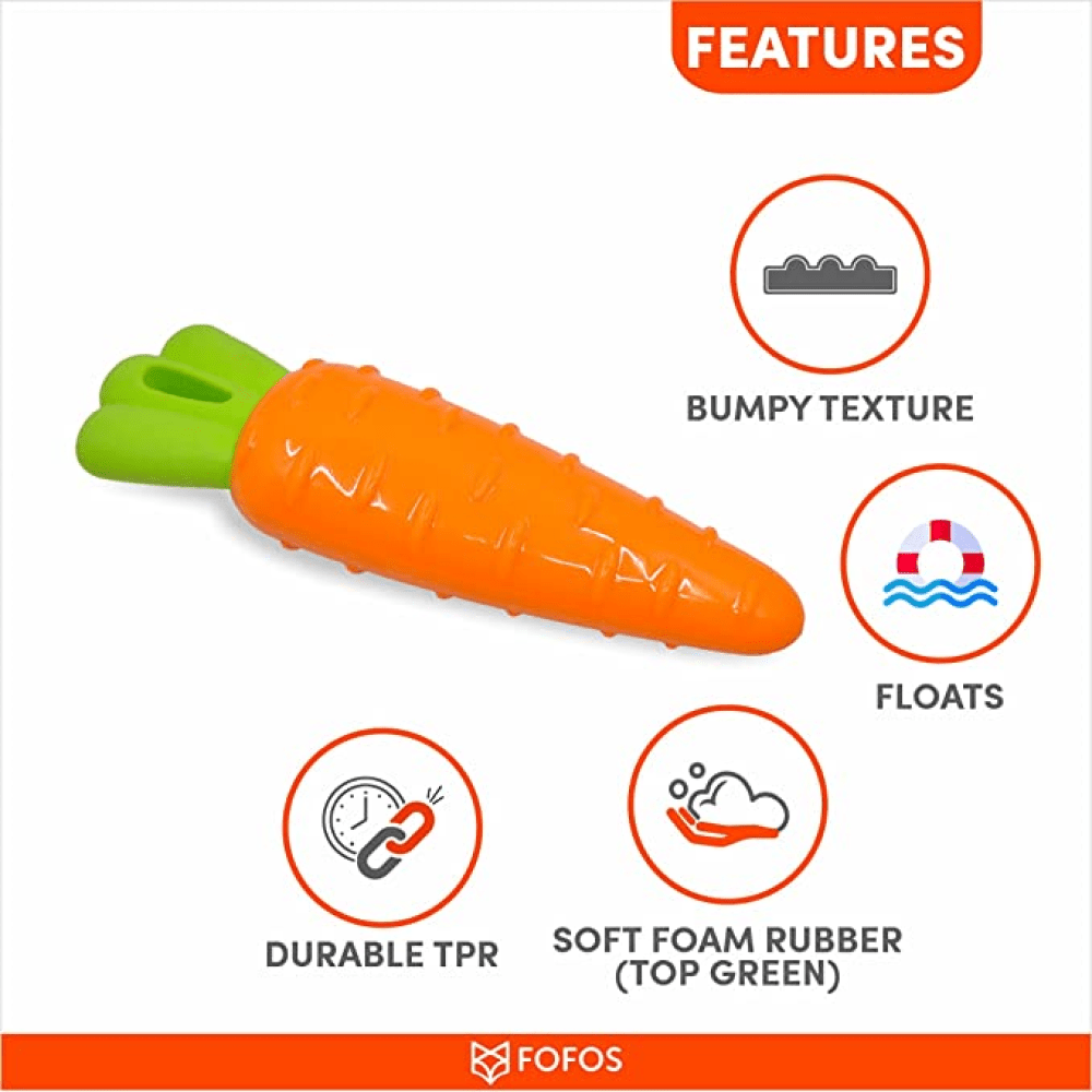 Fofos Vegi-bites Carrot is an engaging screaming squeaker dog toy that generates a loud squeaky noise. This fun toy can float in water and can be used during bath times to distract your pet for a hassle-free experience. This dog toy has a bumpy texture and is good for massaging teeth and gums. The green top of this toy is made from soft foam rubber and the bottom is made using durable TPR. Interactive dog toys such as this allow your dog to chew, fetch, and bite on them while getting the right amount of exercise. This toy is ideal for x-small-small dogs (0-10kg) of various breeds such as dachshund, pom, spitz, etc . This toy is strong but not indestructible and is best suited for pet dogs that have moderate chewing, and fetch playing style. Not recommended aggressive chewers.