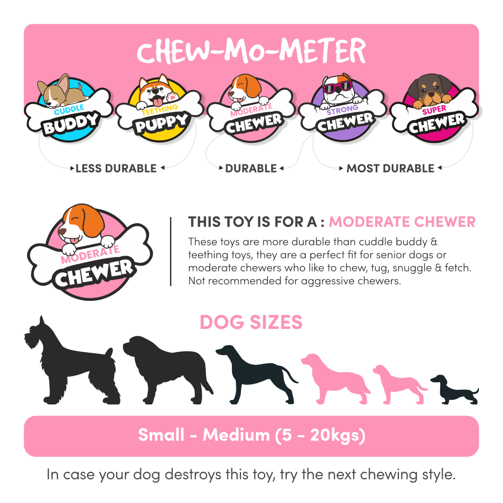 - For Moderate Chewers – Moderate chew toys are the perfect fit for senior dogs or just gentler chewers. Not recommended for aggressive chewers.