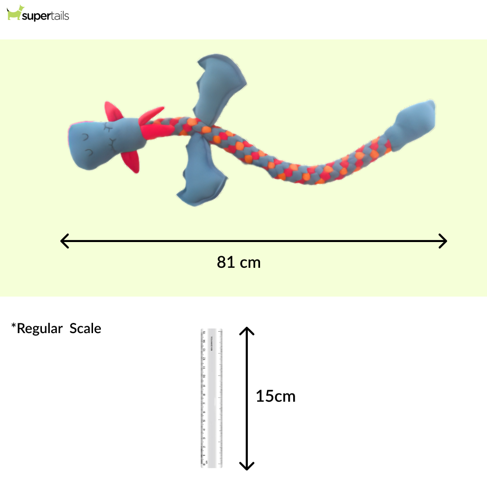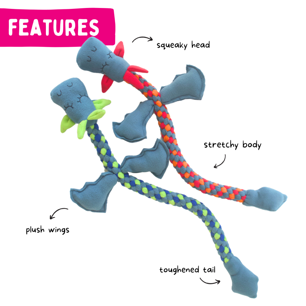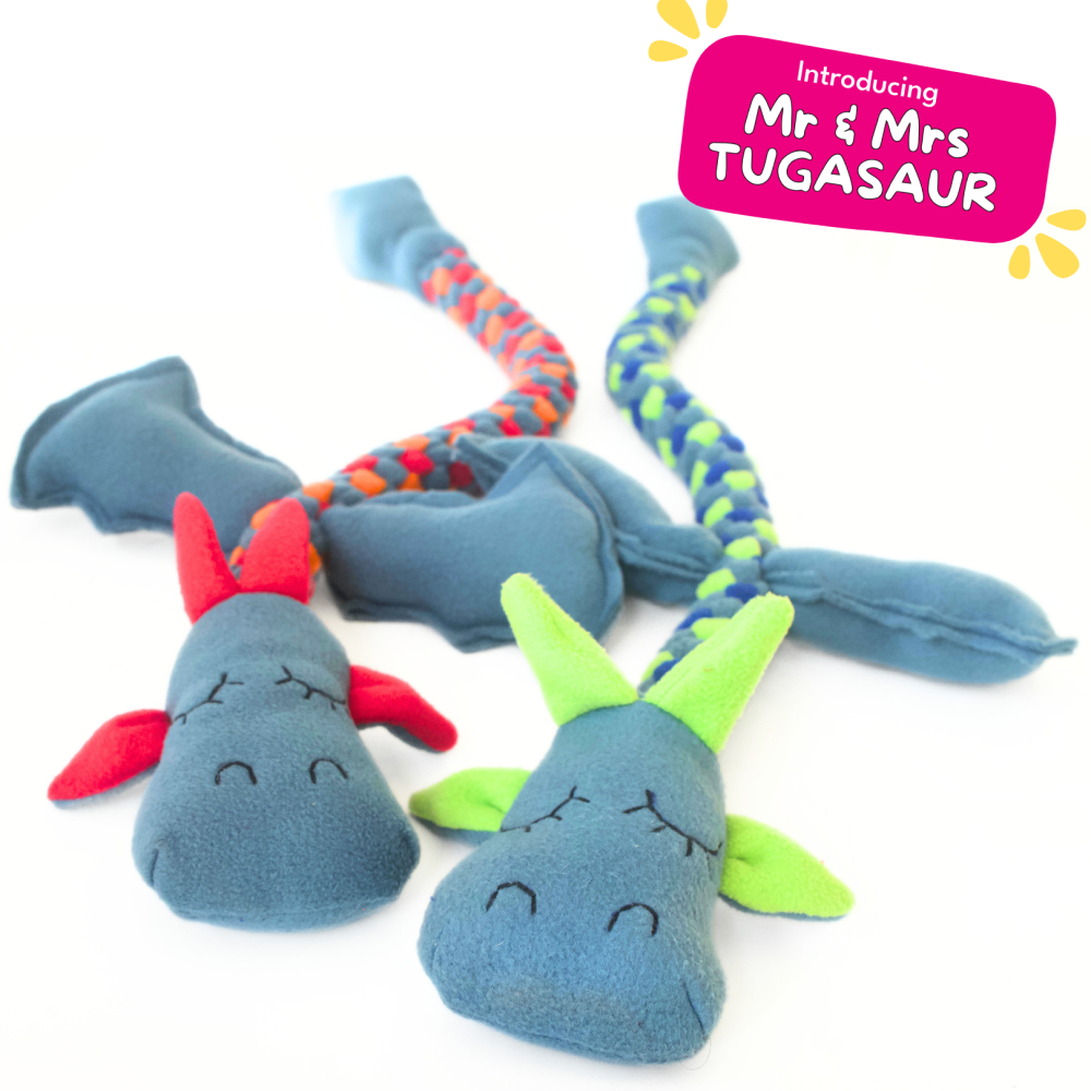 Squeaky headed, strong bodied and oh so adorable – meet Mr & Mrs Tugasaur! With two squeakers in the head, a super long & stretchy body, and a bite worthy tail – upgrade your dog’s tug game with our Tugasaurs 🐾 This toy contains 2 squeakers, that are encased in a secure canvas pouch. Made with high quality, thick, polar fleece, the tug is strong, long lasting and anti-fray.