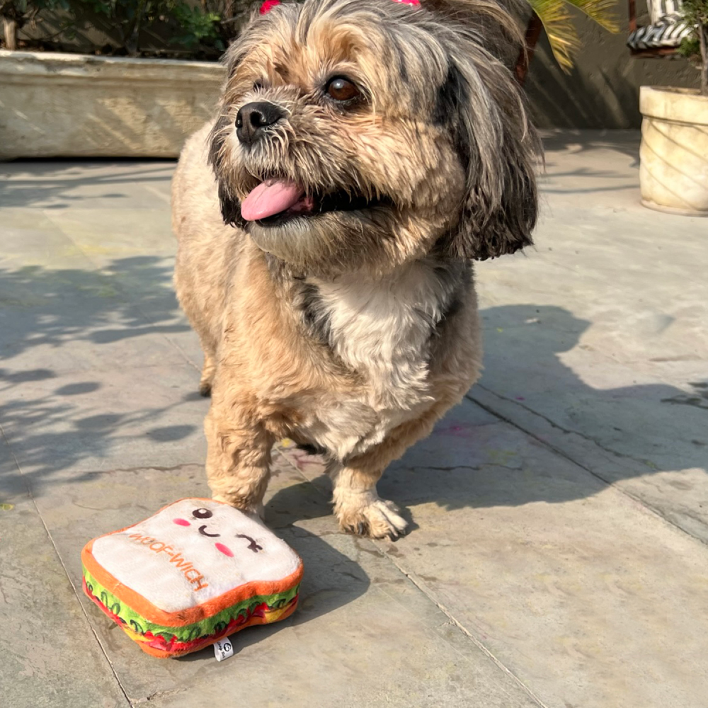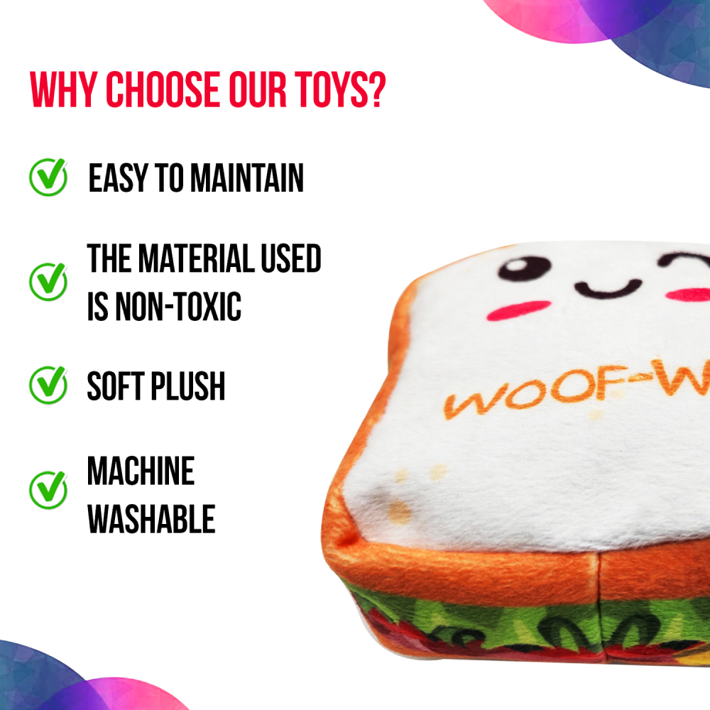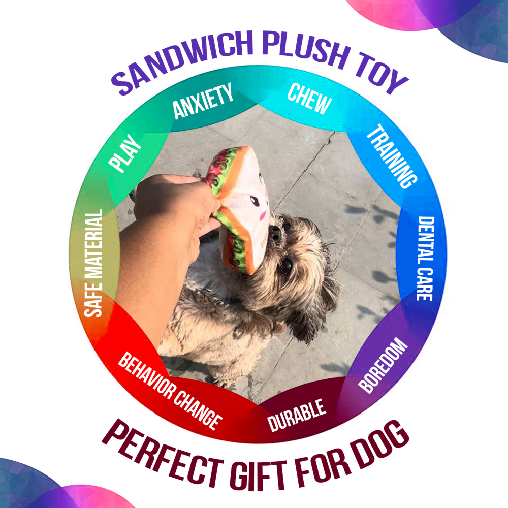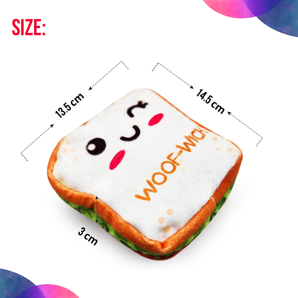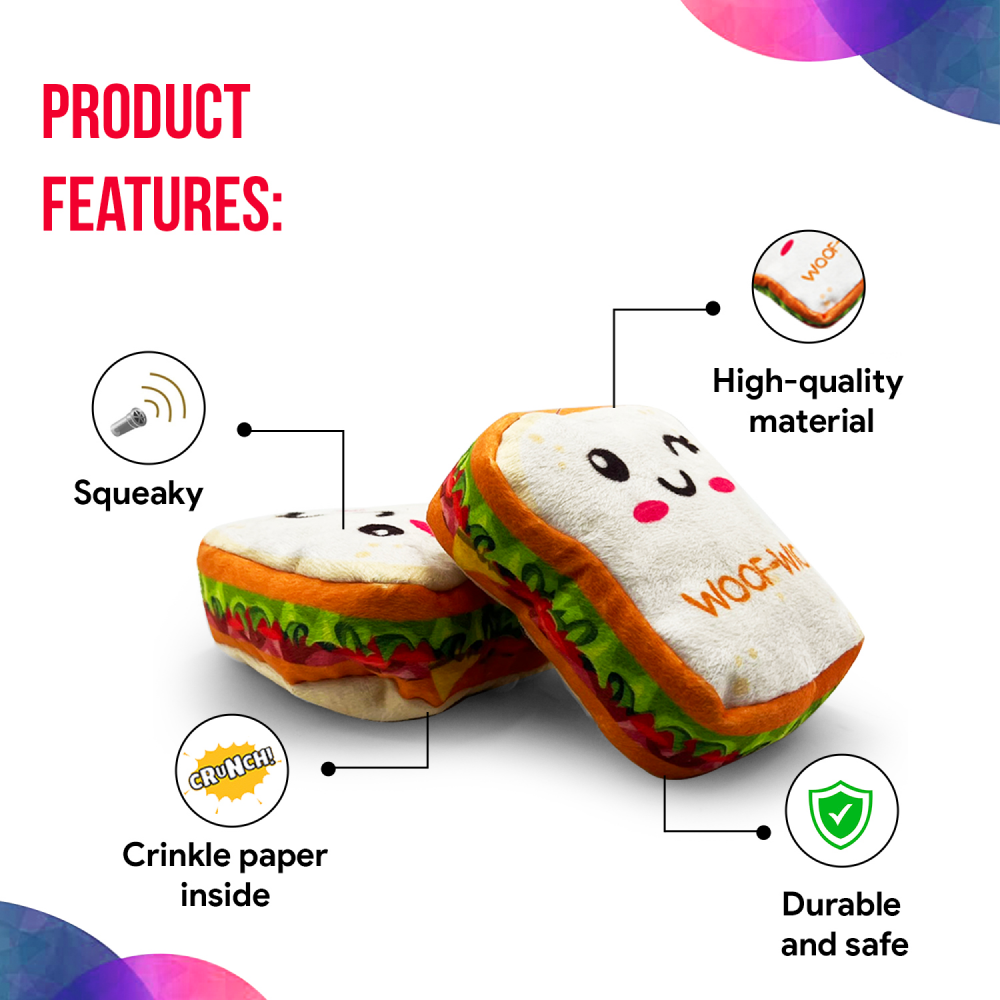 - Sandwich Dog Toys: This is a Sandwich dog Toy that your puppy could also enjoy with treats. Made of soft and high-quality material, your furry friend will be entertained during the playtime.