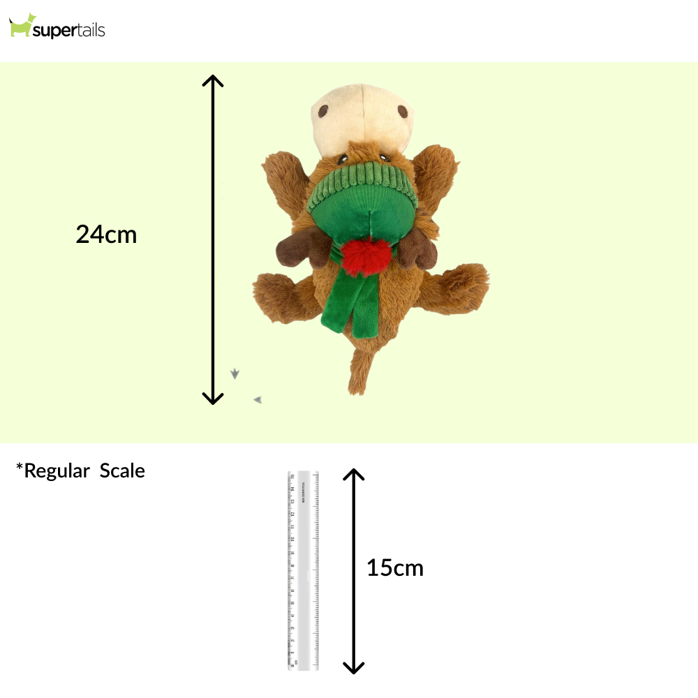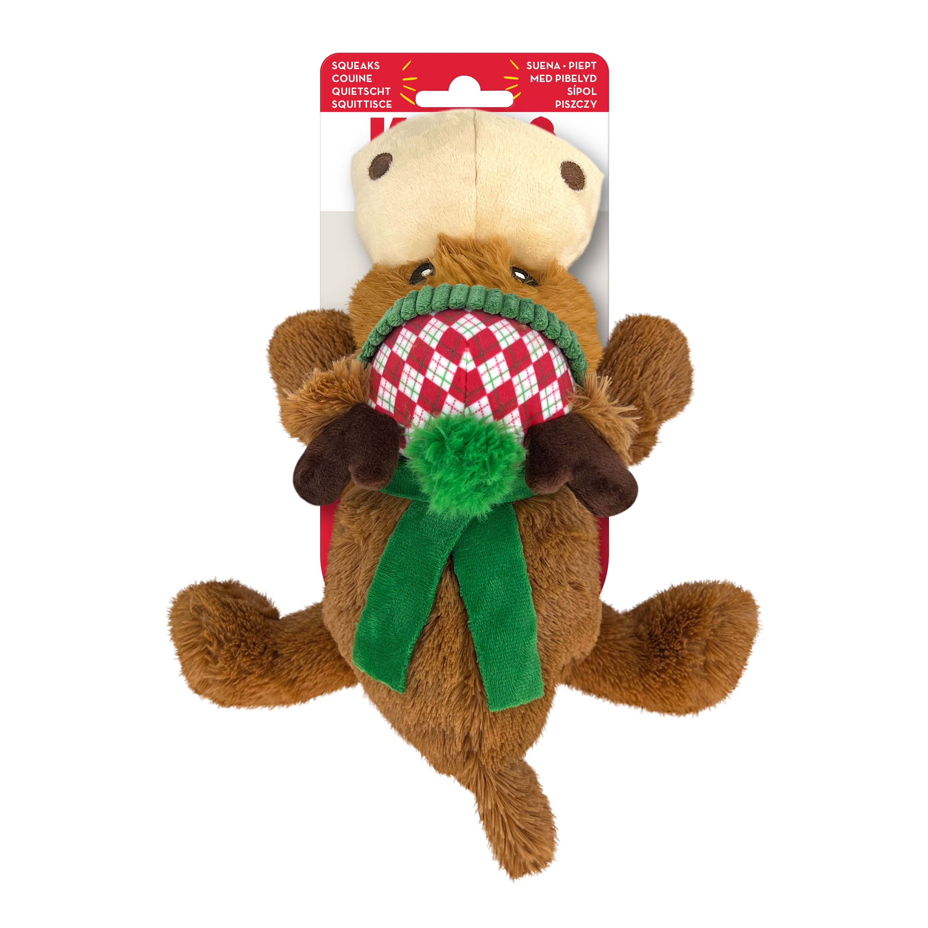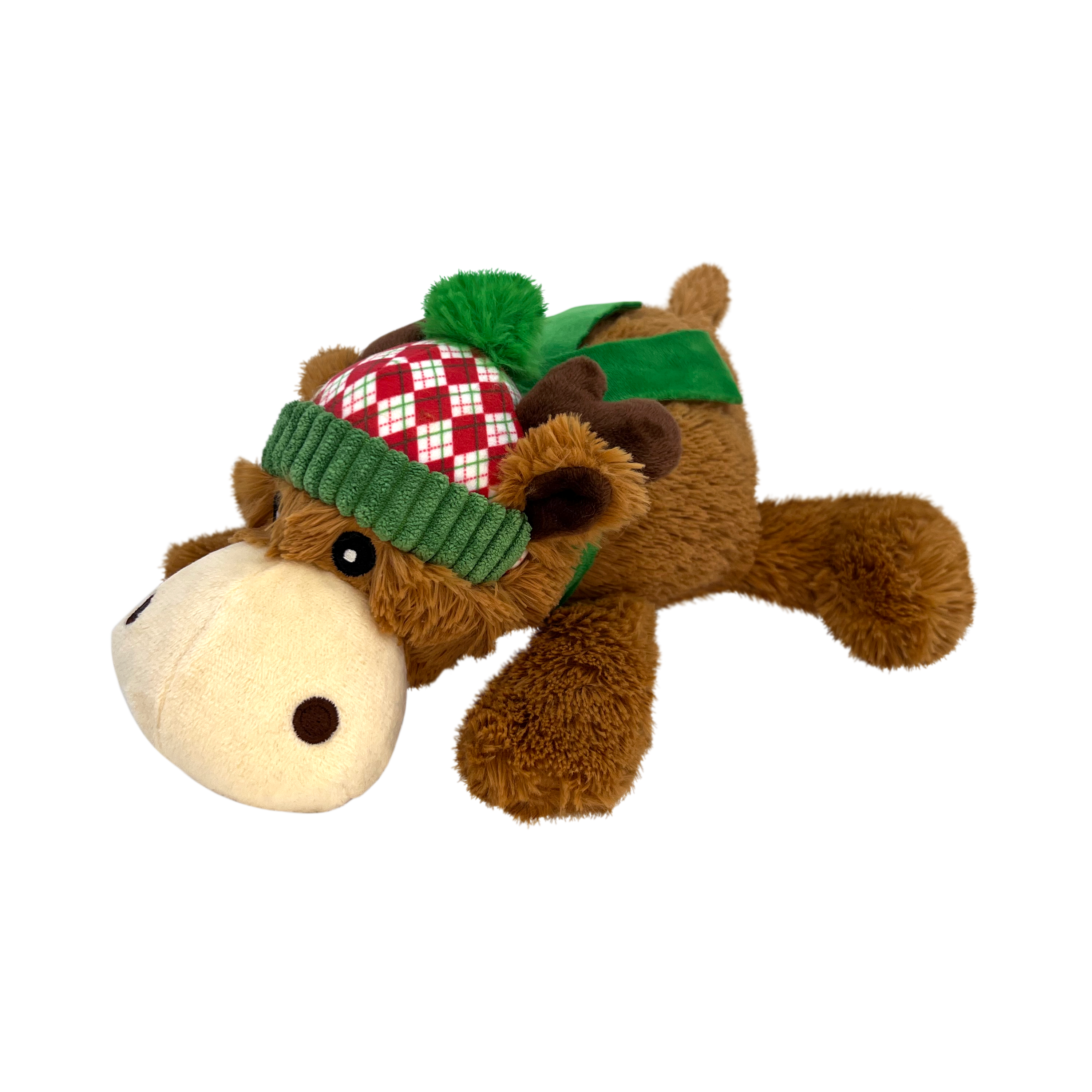 KONG Holiday Cozie Reindeer’s luxuriously soft plush makes him an ideal snuggle buddy for dogs during the busy holiday season—complete with seasonal snowcap and scarf to brighten festivities. The cuddly fur is reinforced with an extra layer of material so this adorable pal will still be around to play for seasons to come!