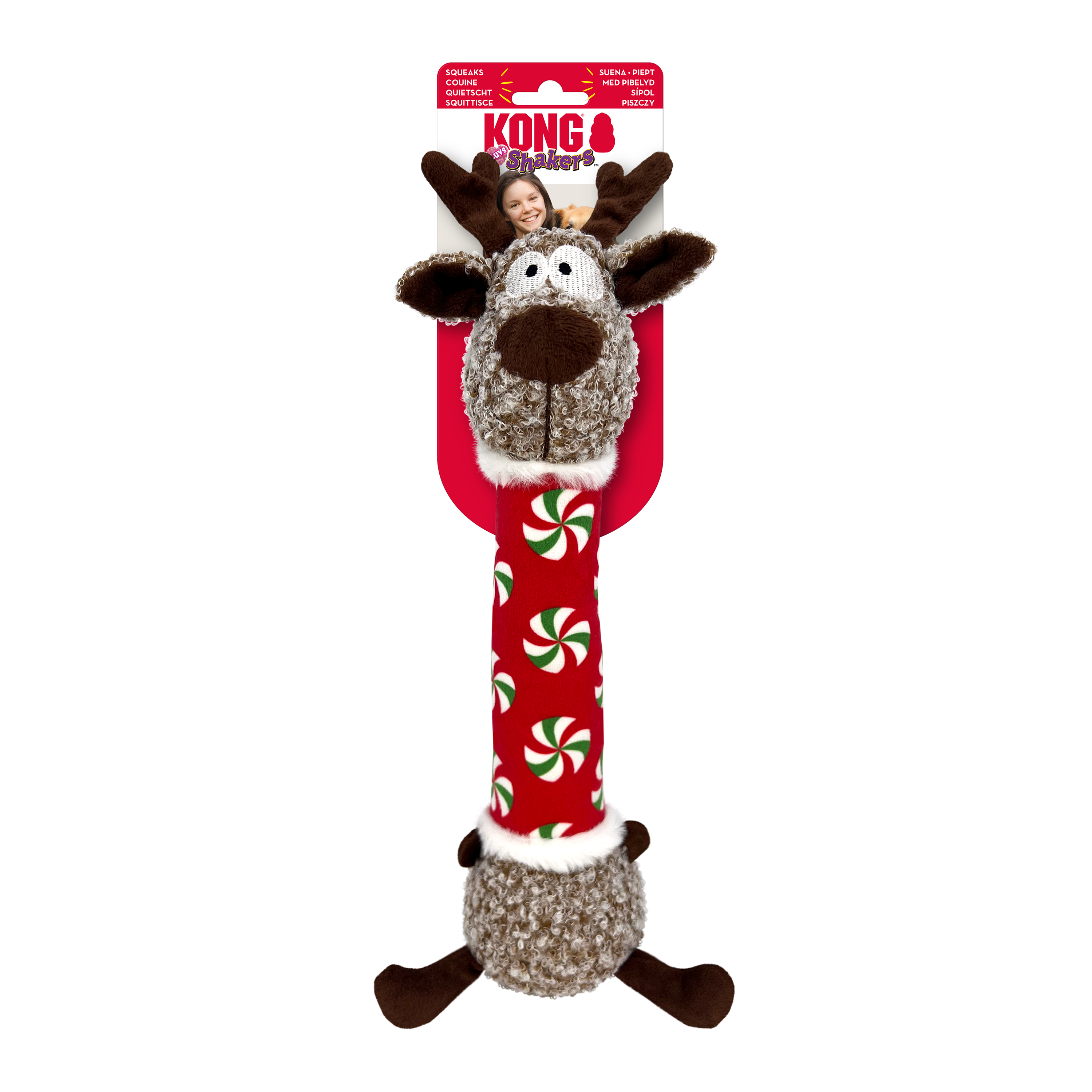 KONG Holiday Shakers Luvz Reindeer’s long, floppy body satisfies dogs’ shaking instincts—and is also ideal for sliding down chimneys. Low-tone squeaker keeps dogs playing through the holidays and beyond, providing tons of healthy, active play with a pal dressed up for the holidays.