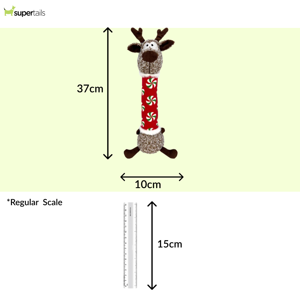 - Cute and squishy reindeer design with squeaker radiates holiday cheer.