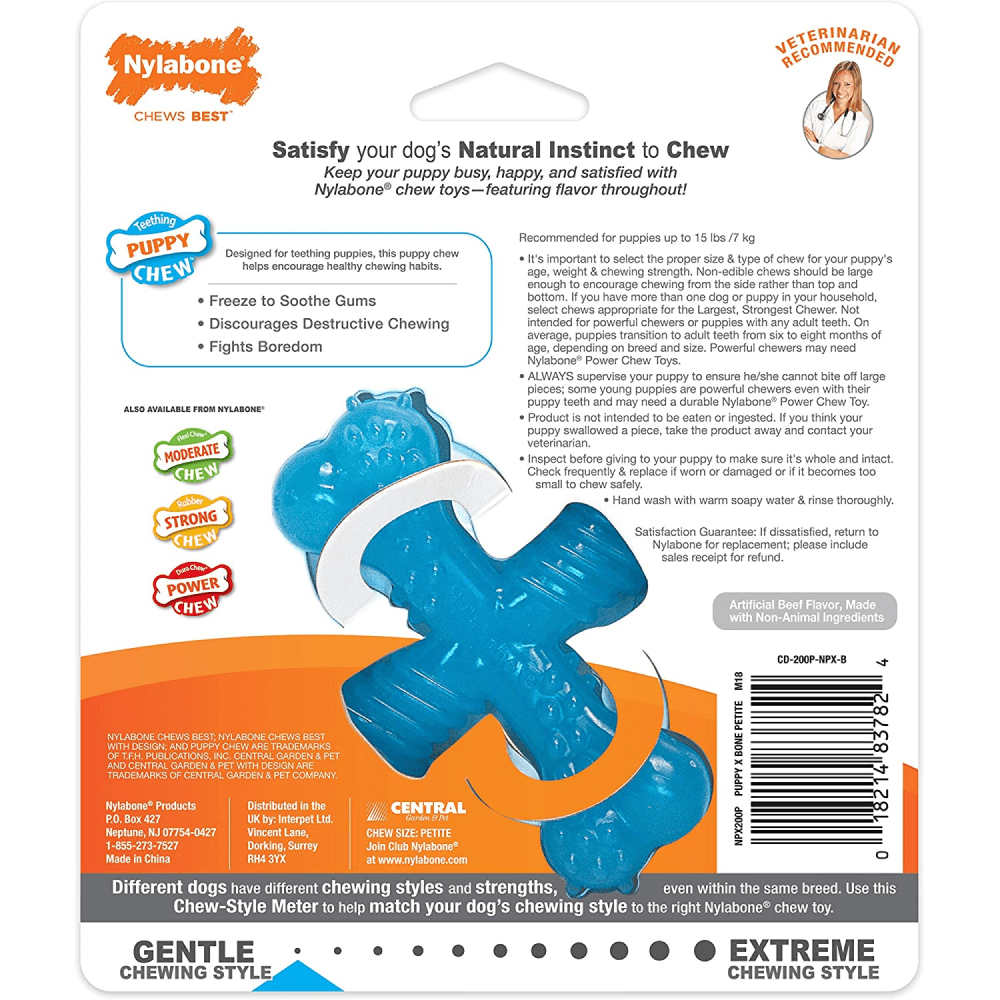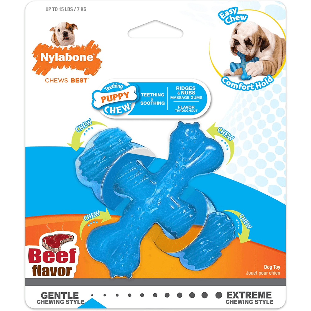 The Nylabone Puppy Teething Beef Flavored Chew “X” Bone Toy is specifically designed for teething puppies who need a safe and satisfying outlet for their chewing instincts. This Puppy Teething Toy is crafted with a beef flavor that entices your puppy to engage with the toy, this chew bone helps alleviate the discomfort of teething by massaging their gums and cleaning their teeth as they chew. The durable yet gentle material is perfect for a puppy’s delicate teeth, ensuring they can enjoy the toy without the risk of damaging their growing teeth.