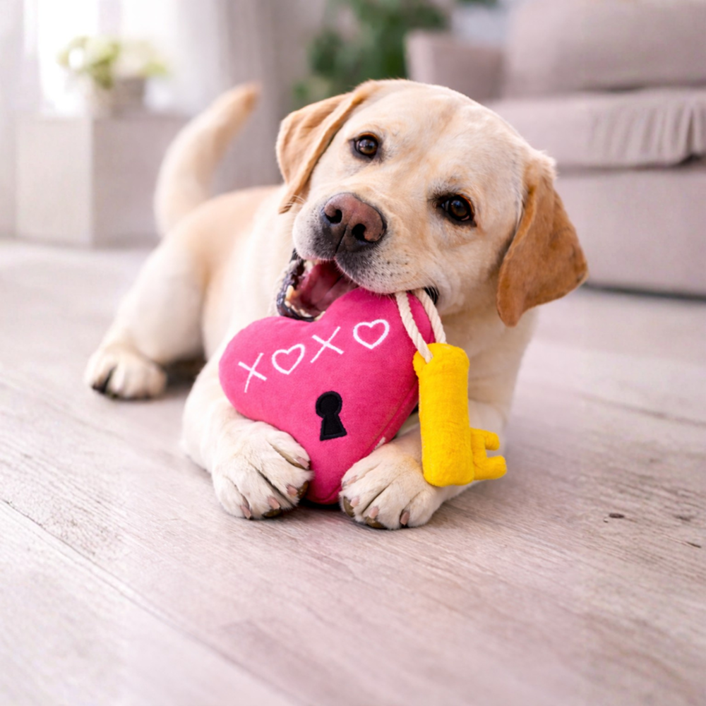 Unlock a new level of playtime with this adorable Heart Lock and Key Toy. Featuring a vibrant pink heart “”lock”” and a golden “”key,”” this toy is connected by a sturdy cream-colored rope, making it perfect for dogs who love to carry their trophies around or engage in a light game of tug.