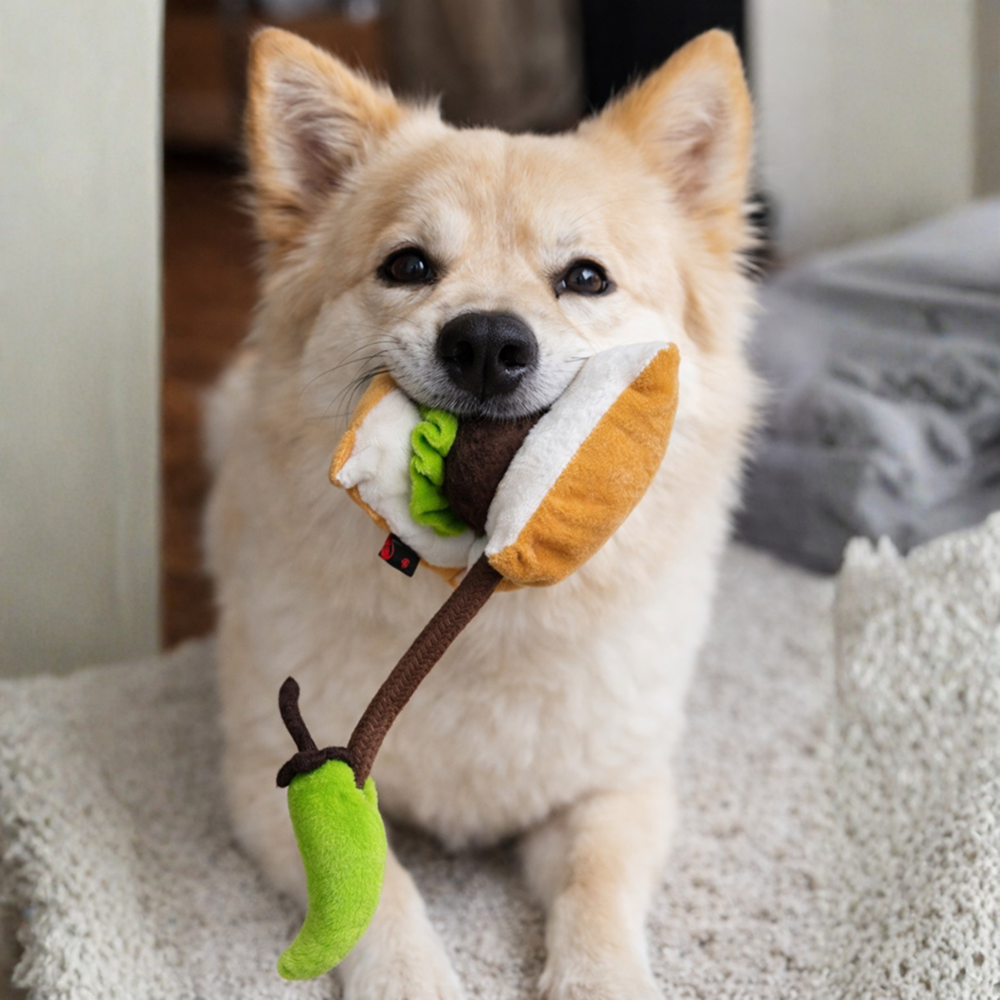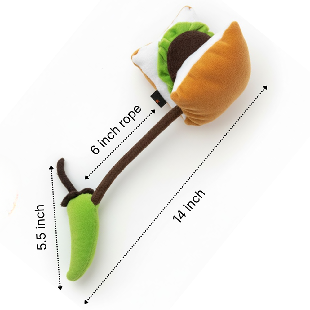 “Interactive Vada Pav Dog Toy – Squeaky Plush with Attached Mirchi Rope