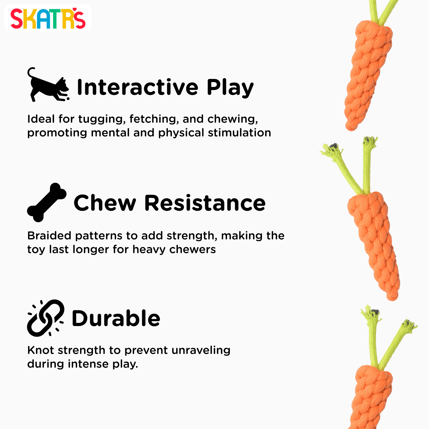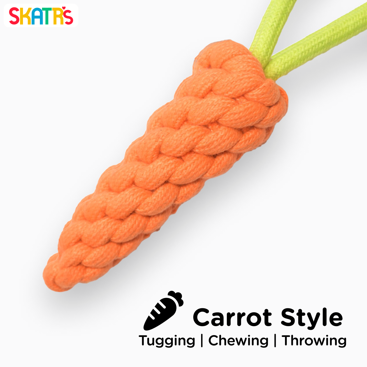 Introducing the Skatrs Carrot Shaped Rope Chew Toy—a delightful and durable plaything designed to captivate the attention of both dogs and cats. Featuring a vibrant orange carrot shape, this toy combines visual appeal with practicality.