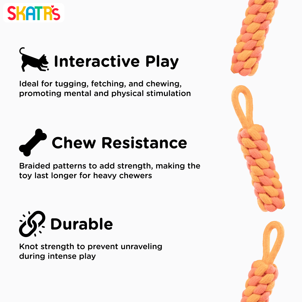 SKATRS Dummy Knotted Rope Dog Chew Toys are meticulously crafted through the artisanal process of intertwining cotton and polyester threads, further reinforced by intricate knotting to enhance strength, protection, and overall durability. These handcrafted Rope Dog Chew Toys feature robust and securely tied knots, ensuring prolonged resilience, even in the face of vigorous chewing habits exhibited by more assertive dogs. In contrast to squeaky or plush toys that succumb to destruction within minutes, these nearly indestructible dog toys provide enduring entertainment for your canine companion, whether utilized indoors or outdoors for play or training purposes.