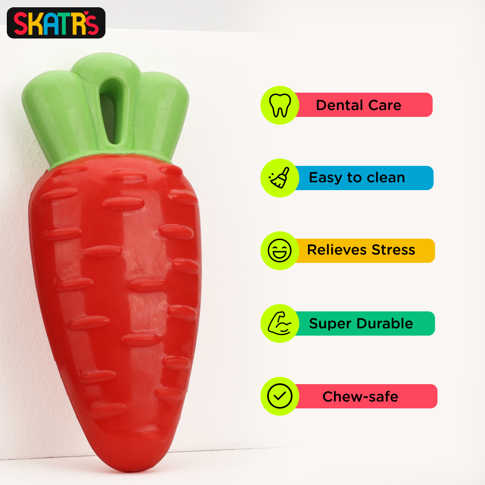 Introducing the SKATRS Rubber Squeezy Carrot Toy for Dogs, a durable and versatile toy for interactive playtime with your pets. This toy is made from tough and chew-resistant rubber, making it suitable for pets of all sizes.