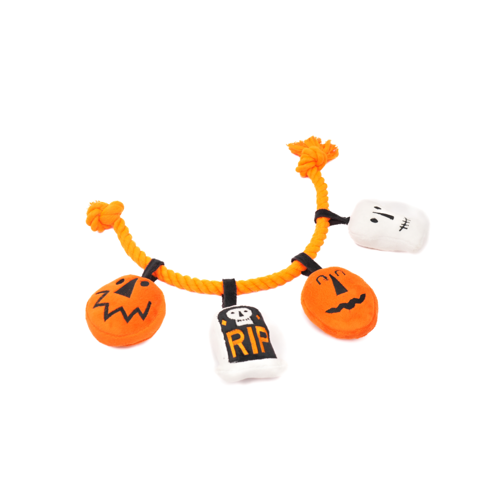 • Festive Halloween fun: Includes four plush characters—jack-o’-lantern, tombstone, mummy, and ghost—attached to a rope.