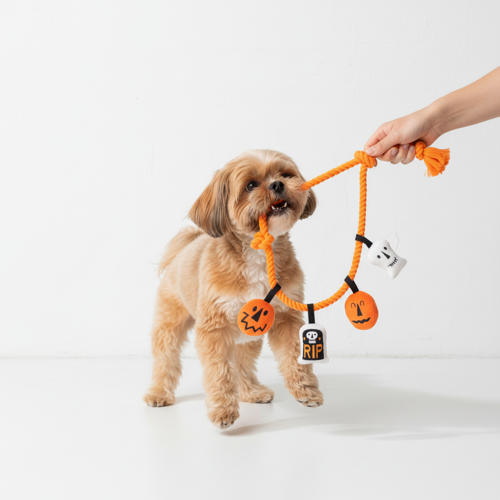 Make this Halloween a tail-wagging, squeaky-fun adventure with the Skatrs Trick-or-Tug Rope Toy! This festive rope toy features four spooky plush friends—a jack-o’-lantern, a tombstone, a mummy, and a ghost—perfectly attached to a durable rope for interactive play.