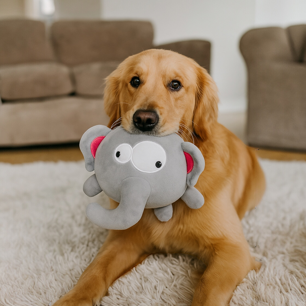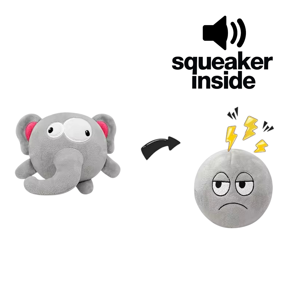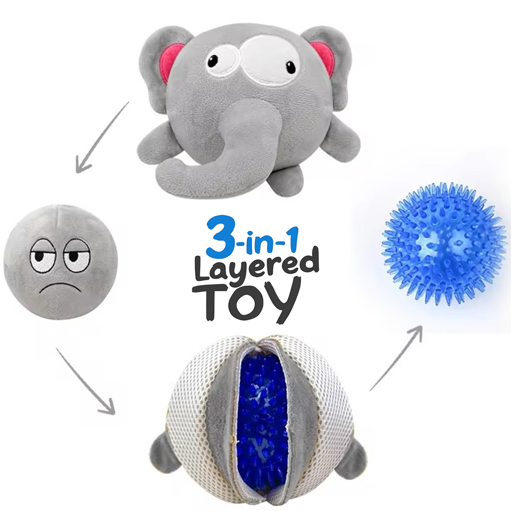 • 3-in-1 Layered Toy – A playful surprise with three layers: plush Elephant exterior, soft Grey fabric ball, and an inner spiky rubber ball for triple the excitement.