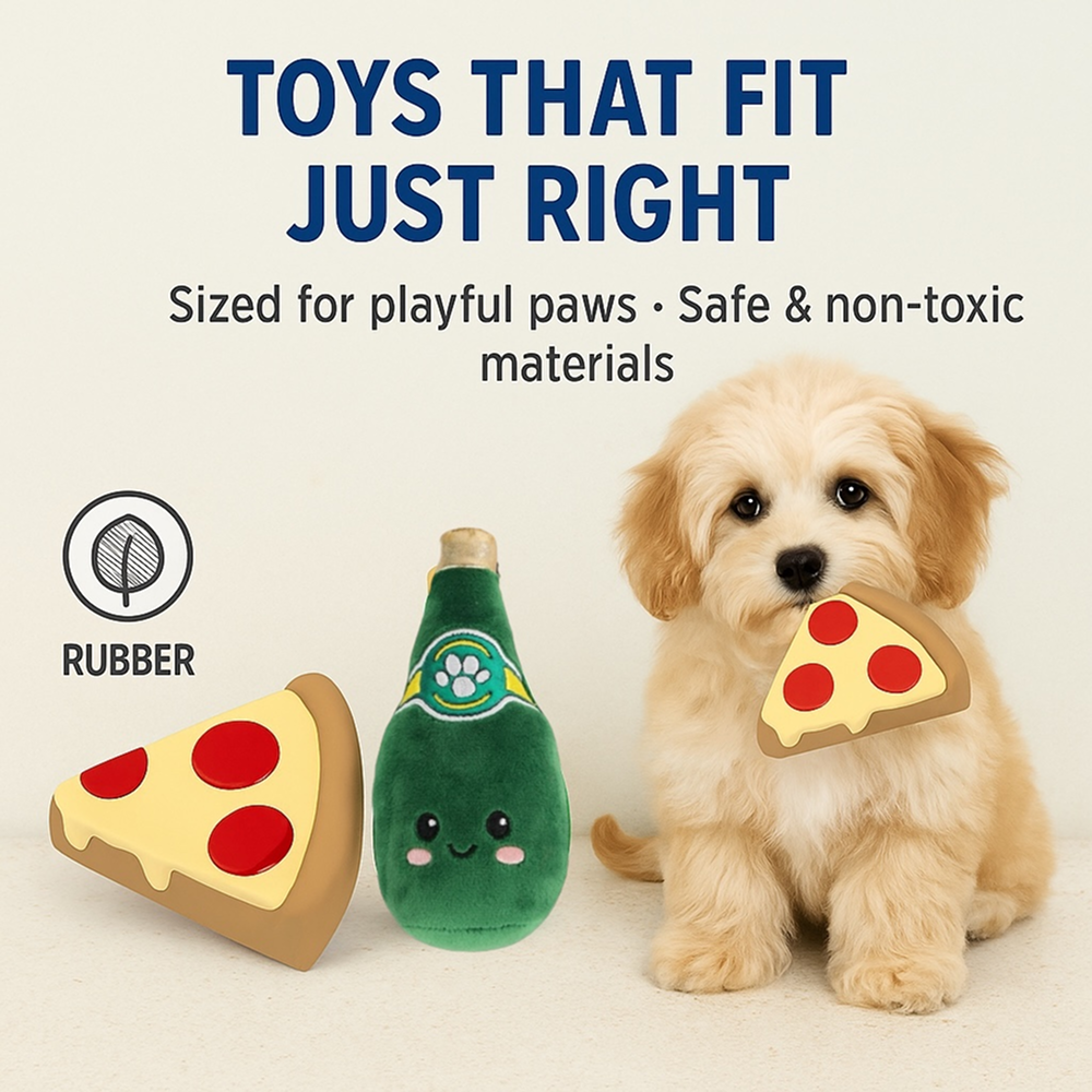 Whether you’re looking to add fun variety to your pup’s toy box or just want them to carry their favourite “meal,” this compact duo is perfect for small breeds and puppies. Lightweight and easy to carry, these toys are just the right size for little mouths with big appetites for fun!