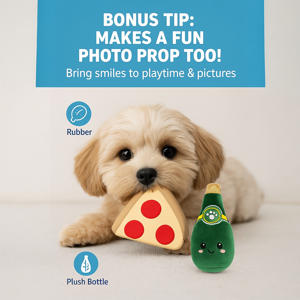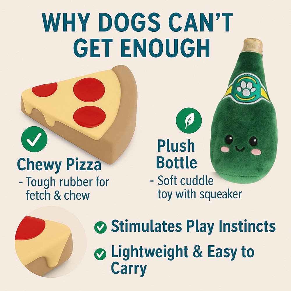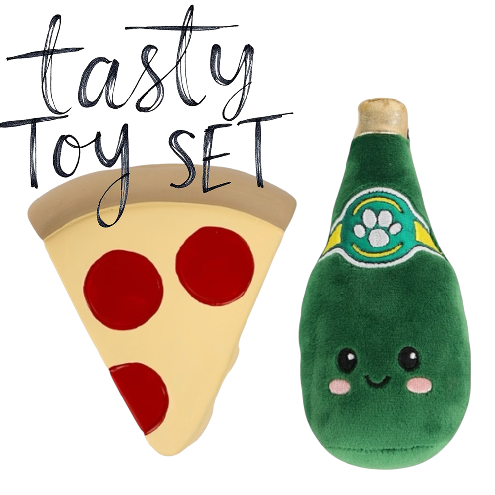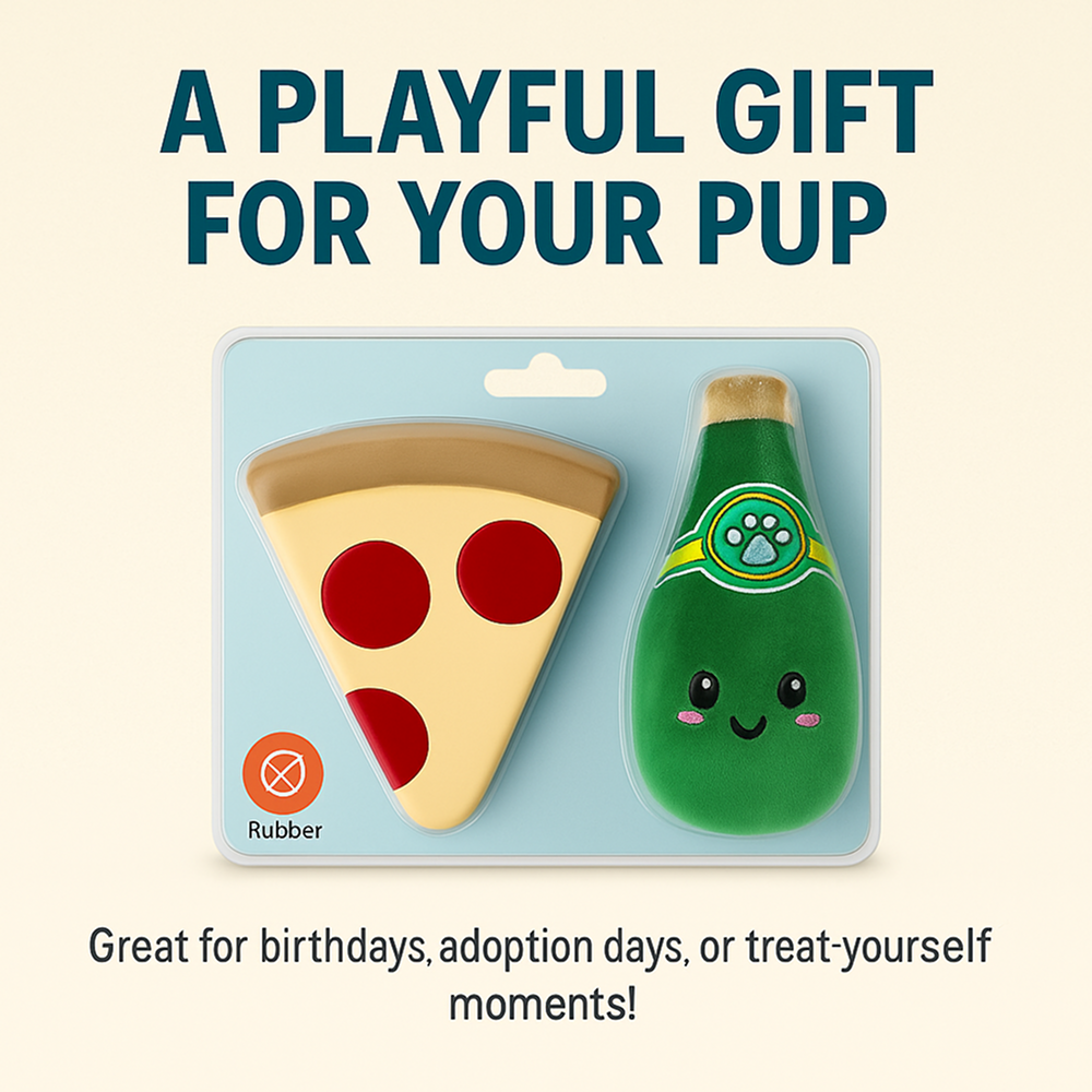 Turn treat time into playtime with the Talking Dog Club’s Pizza and Perrier 2-Pack Dog Toy Set! Designed with irresistibly cute food shapes, this playful combo includes a latex pizza slice and a soft plush Perrier bottle, giving your pup different textures to chew, bite, and enjoy.