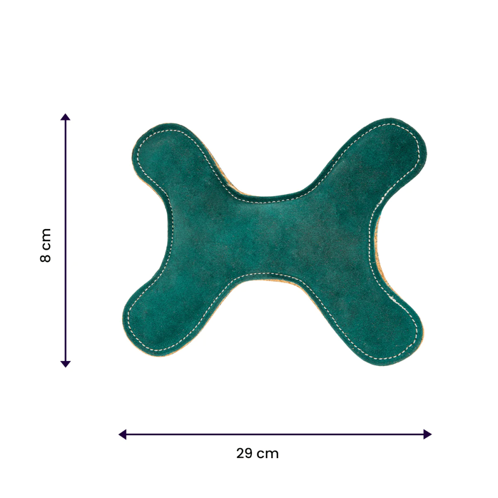 This high-end pet toy is made of high-quality leather. White stitching is eye-catching. It has dried coconut husk inside as filler. For a more sustainable environment, use recycled bottles. We recommended it for playing fetch. A squeaker is included.