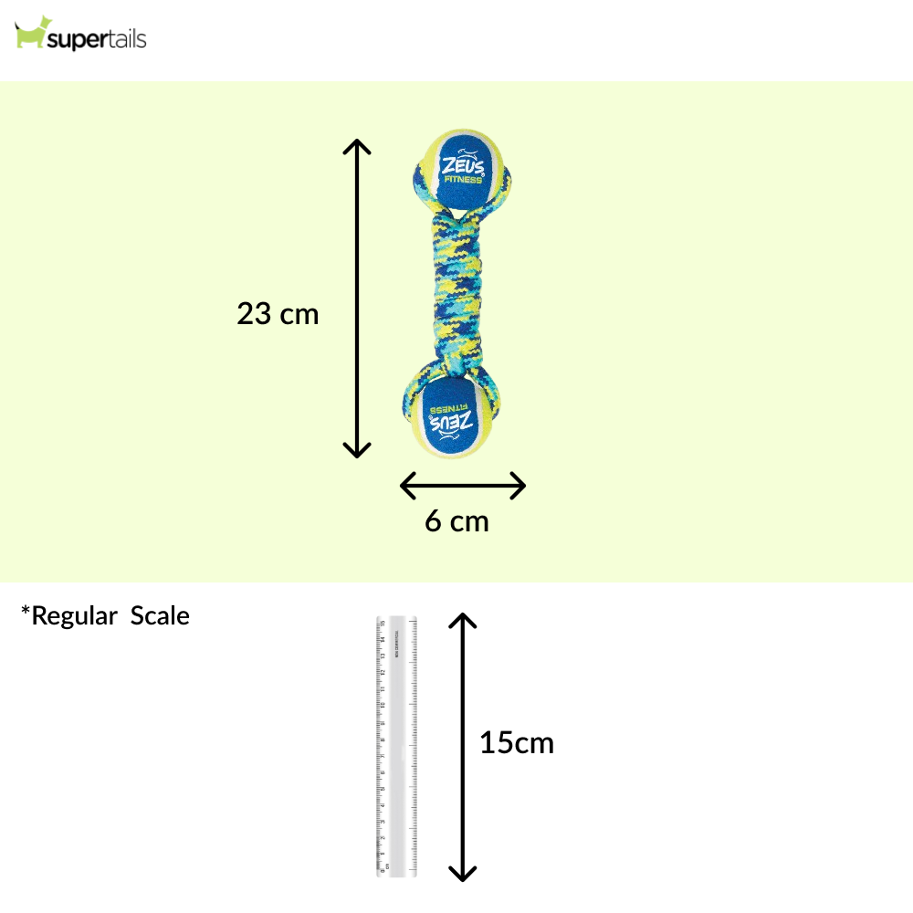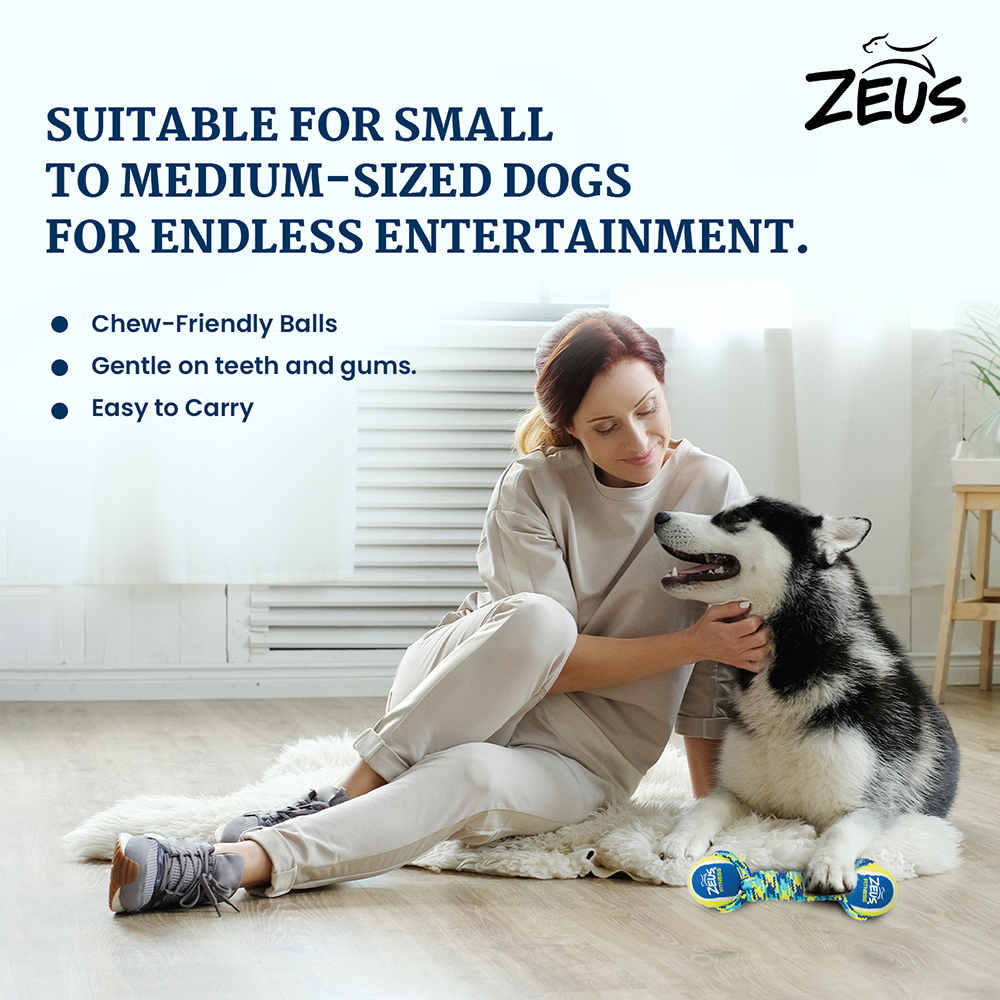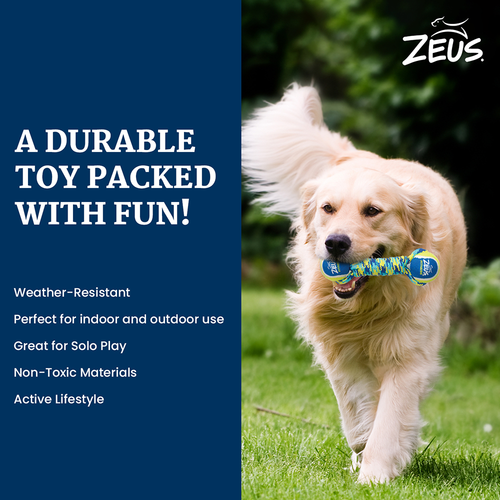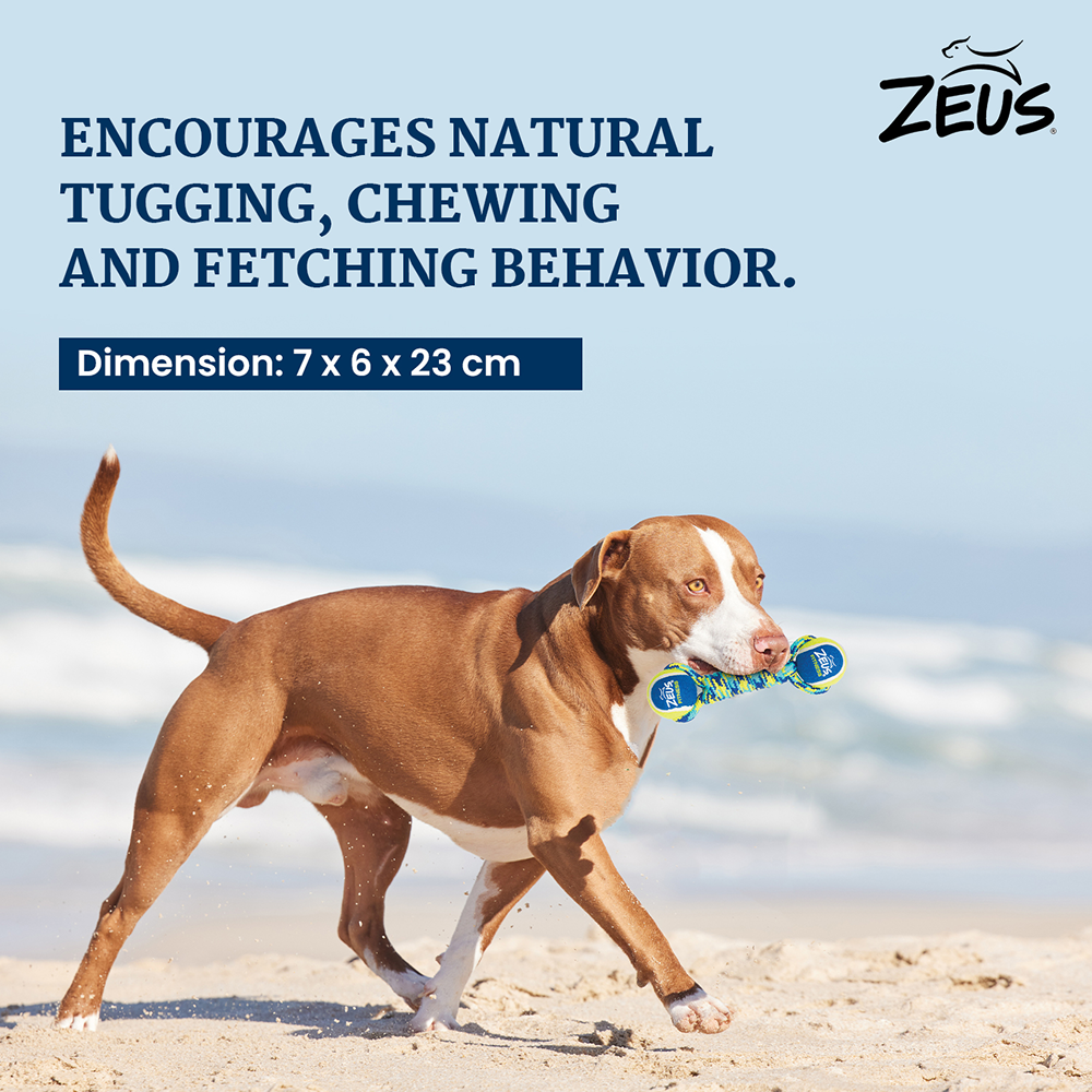 The Zeus Double Tennis Ball Rope Dumbbell is a durable and engaging toy for dogs that combines the fun of tennis balls with the durability of a strong rope. Perfect for interactive games like tug-of-war and fetch, this toy keeps your dog entertained while also promoting dental health.
