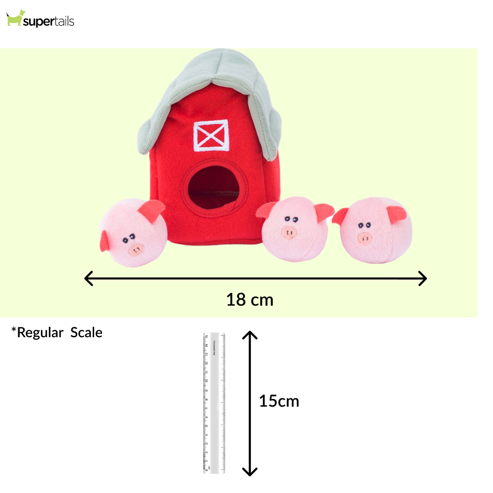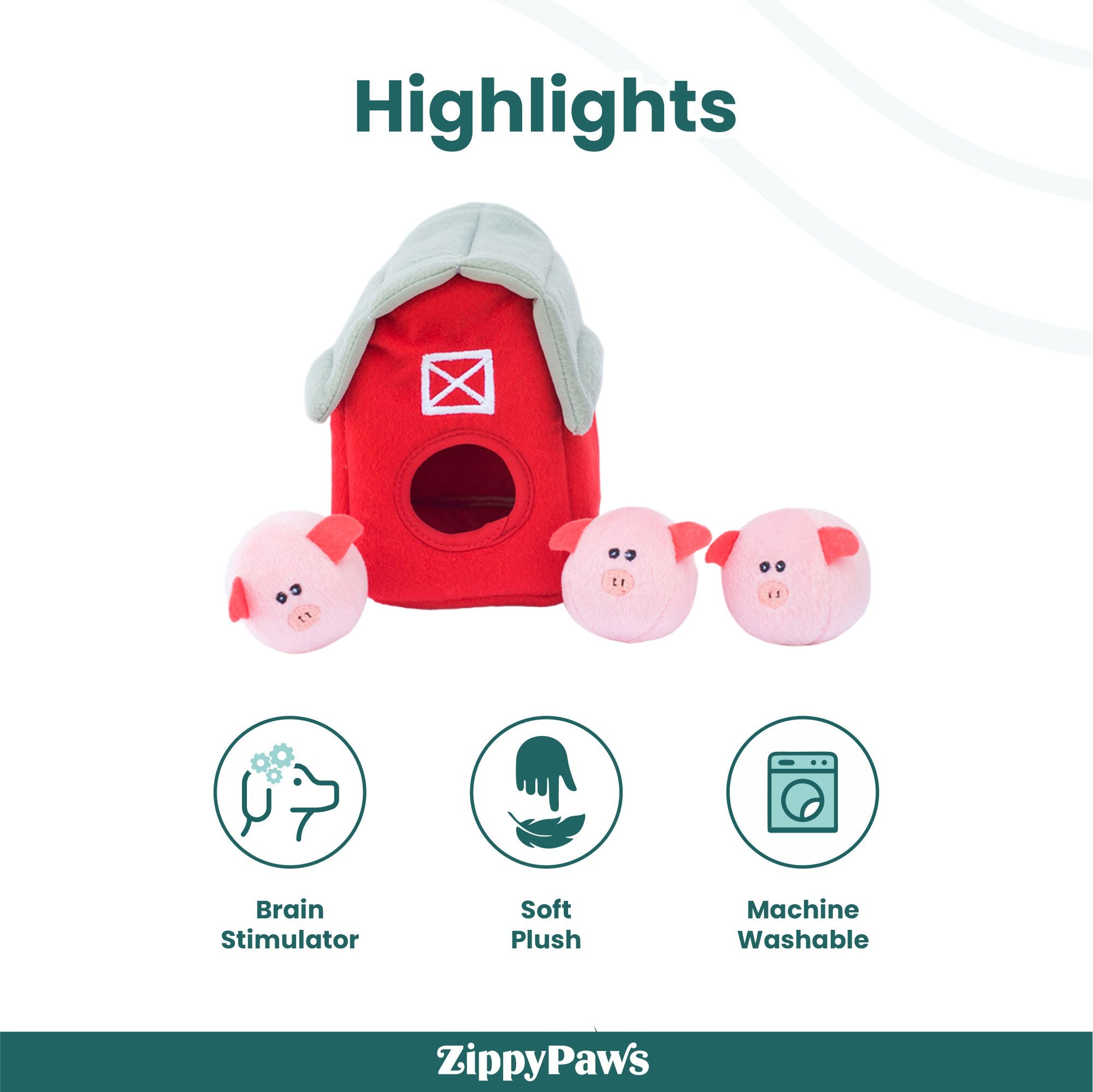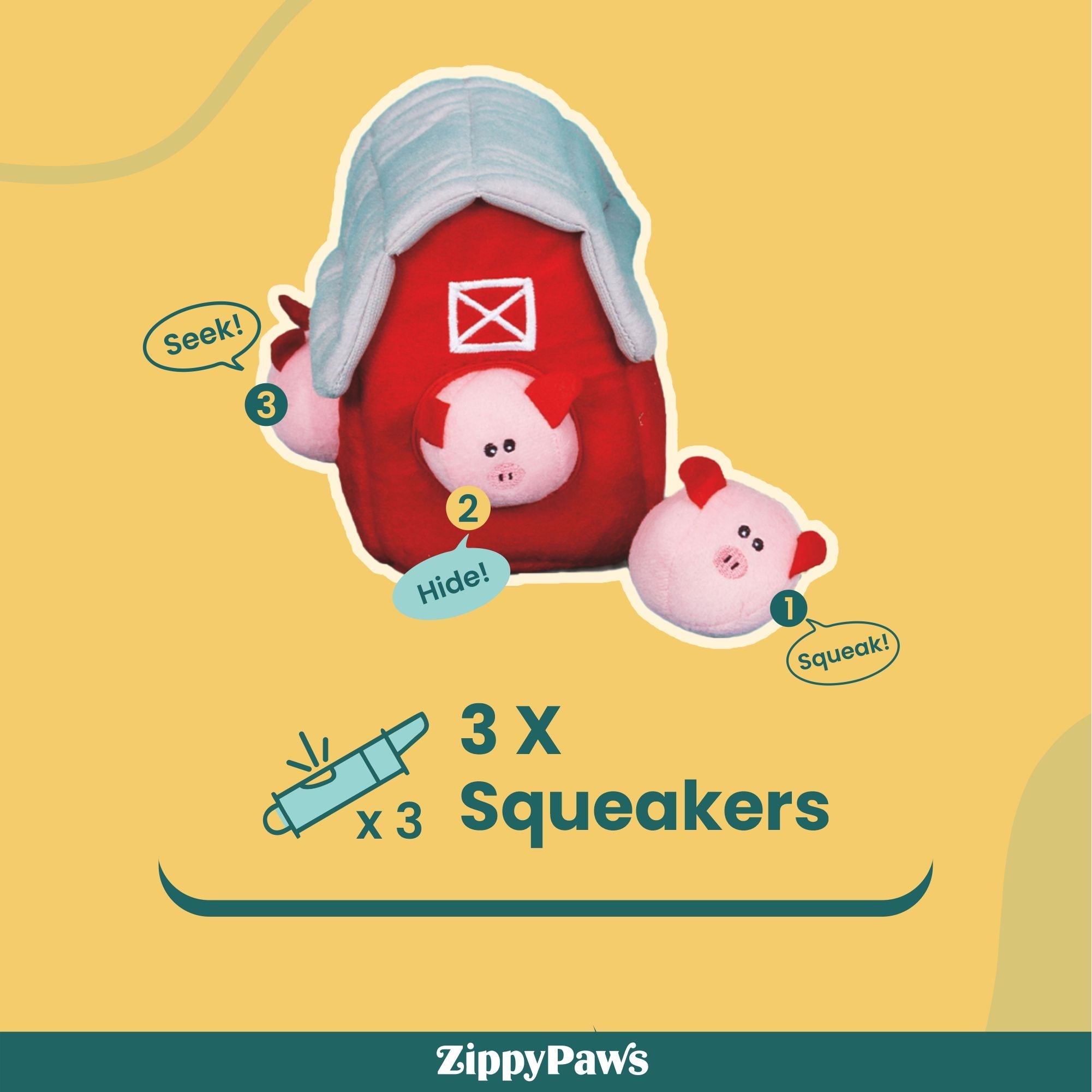 Zippy Burrow® are the perfect interactive toys for keeping your dog busy and engaged. Through hide-and-seek play, Zippy Burrow® toys help prevent boredom and promote mental stimulation! This interactive hide-and-seek toy comes with 1 Pig Barn and 3 small squeaky Pigs. Includes stuffing.