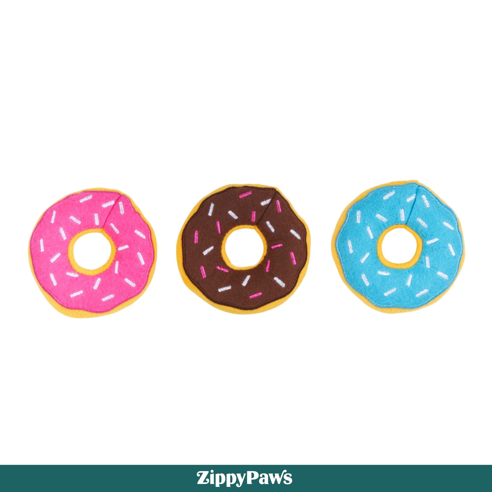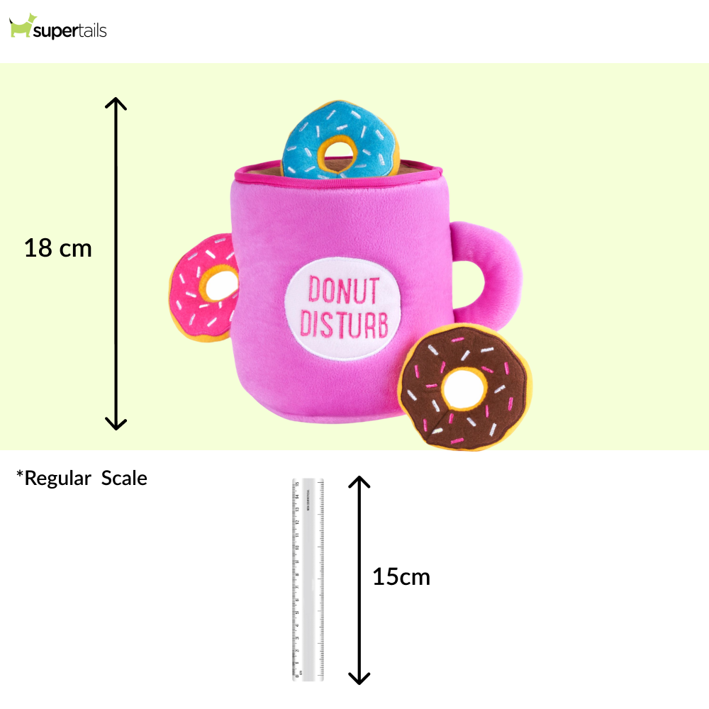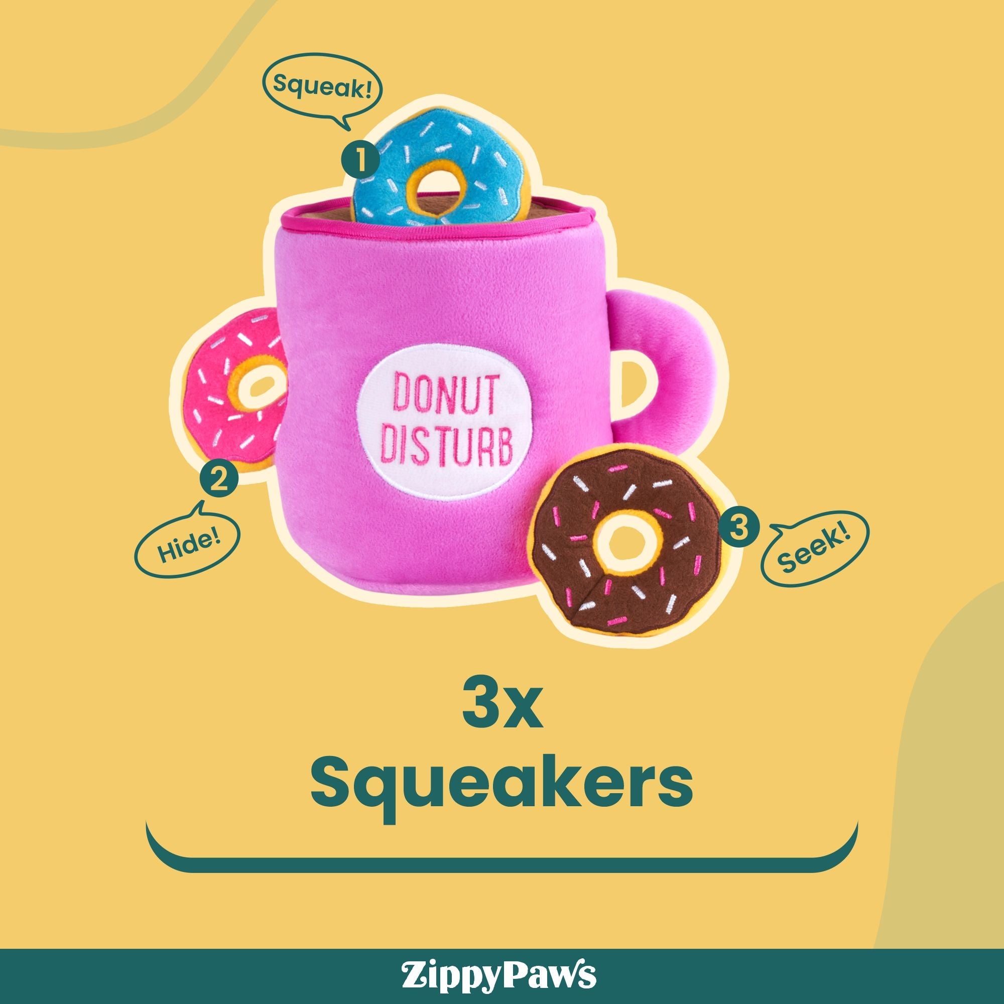 This interactive Zippy Burrow® toy comes with 1 “Donut Disturb” coffee burrow and 3 small squeaky Miniz Donutz. 1 round squeaker in each Miniz. Embroidered details. Contains stuffing.
